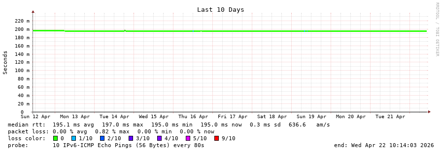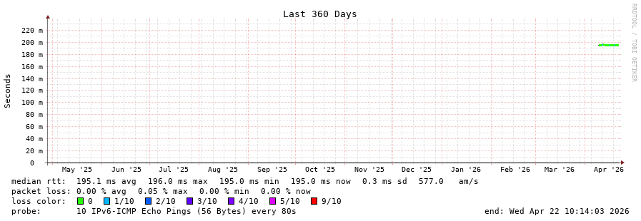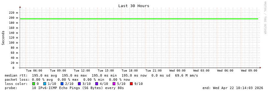 traceroute to 2402:1f00:8400::2:0:19c (2402:1f00:8400::2:0:19c), 30 hops max, 80 byte packets - Generated at 2026-04-22 10:00:01